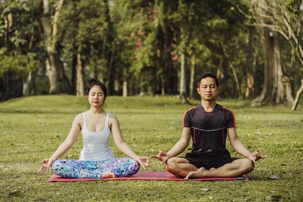 1. Tư thế: Chọn một tư thế ngồi thoải mái, vững vàng trên thảm tập hoặc ghế, đảm bảo lưng thẳng và vai thả lỏng. Có thể ngồi xếp bằng hoặc kiết già, hoặc ngồi trên ghế với hai bàn chân đặt chắc chắn trên sàn. Nhắm mắt hoặc tập trung nhìn vào một điểm cố định, thả lỏng cơ mặt, cổ và vai. Đặt hai tay lên đùi hoặc đầu gối, lòng bàn tay hướng lên.
